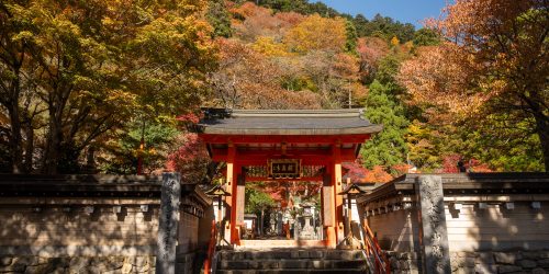 水谷茶屋から若草山の麓を越えて二月堂方面に歩くと、手向山八幡宮(たむけやまはちまんぐう)の境内に入ります。手向山八幡宮ではモミジが色付き始めていました。山門の石段から見るモミジがとても好きなのでまずはこちらから。