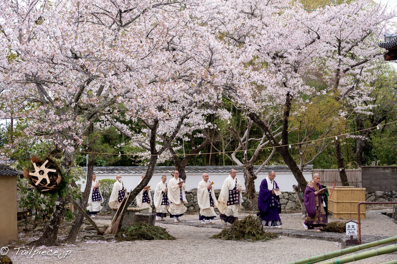 午後5時頃から、本尊薬師如来の前で薬師悔過法要(やくしけかほうよう)と三十二相の声明が行われます。 今年はサクラの開花時期と重なり満開の花の下での入堂となりました。