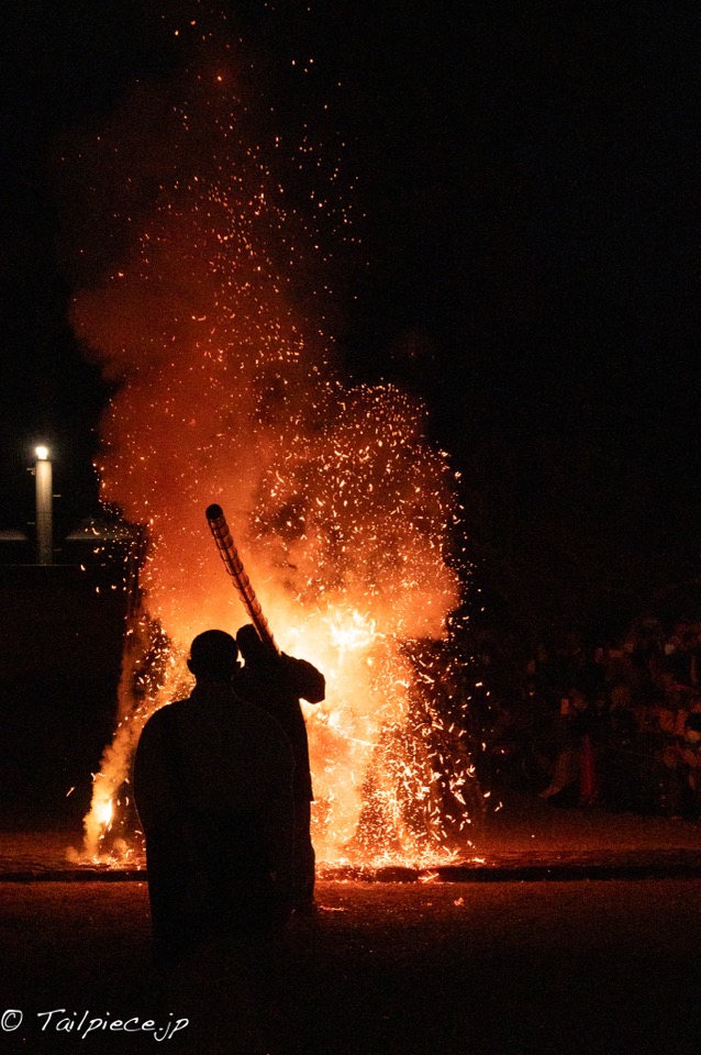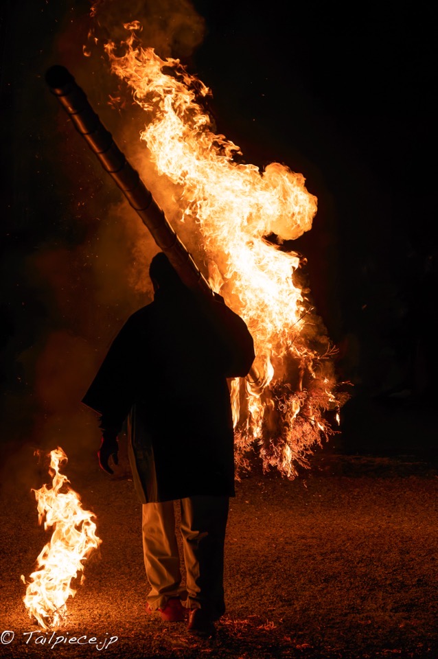 本堂の正面で松明が勢いよく回されると、炎が一気に立ち上がり、あたりに火の粉が飛び散ります。