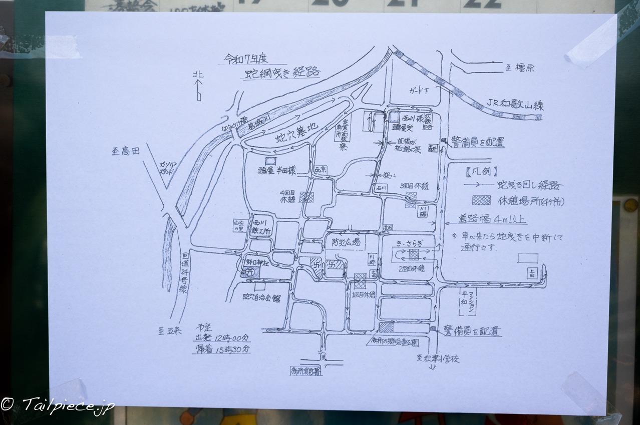 蛇綱は古い集落の中狭い道をあちこち練りまわるので、行列について歩いているとどのあたりを歩いているのかわからなくなります。途中に蛇曵きの経路を示したマップがありました。あちこち隈無く巡っているのがよくわかります。