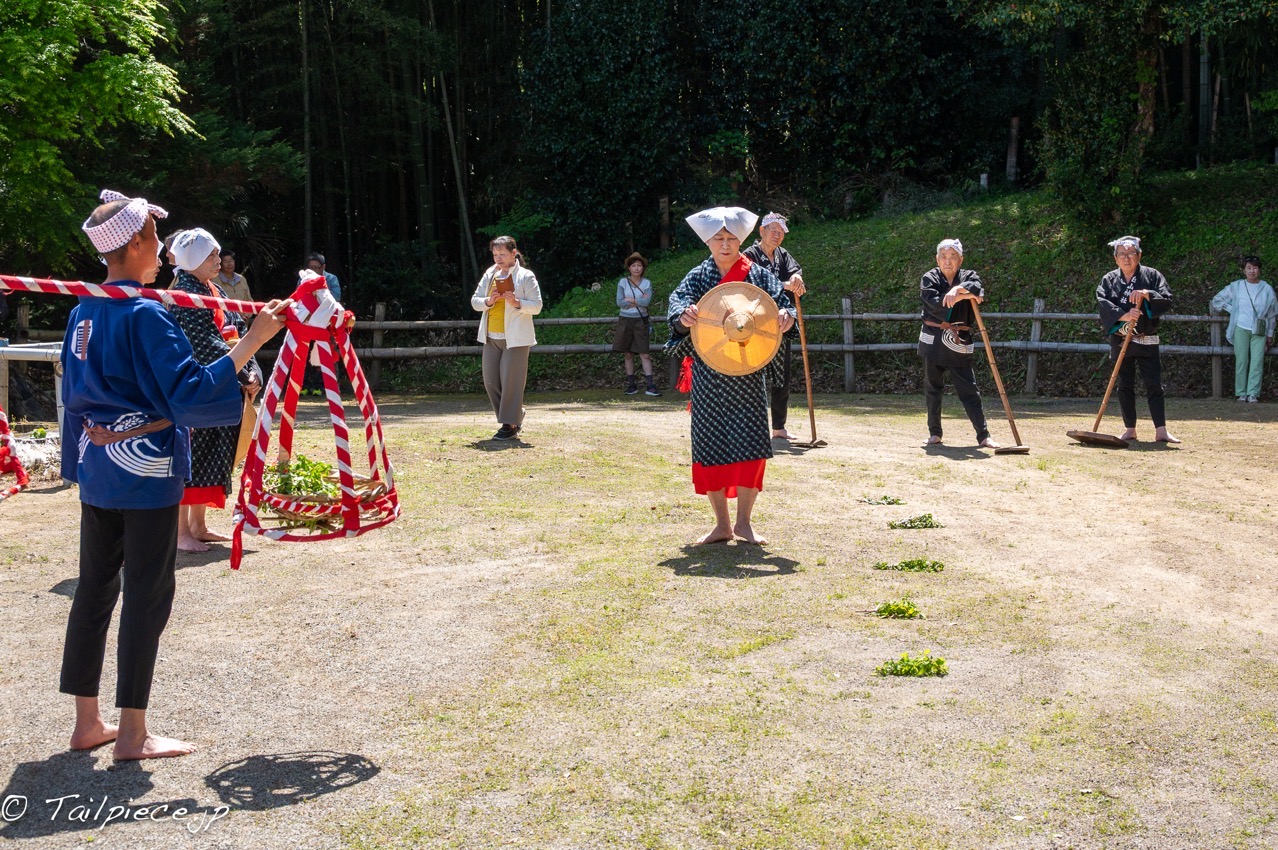 五穀豊穣を願い田作りや田植えの所作をするところは他所のオンダ祭りに似ていますが、主役となる3人の早乙女(しょとめ)を男性が化粧をし、赤い腰巻きで女装して行うのが特徴です。初めて見た時はとても違和感があるのですが不思議に何回も早乙女の所作を見ていると慣れてきて当たり前の光景に見えてきます。