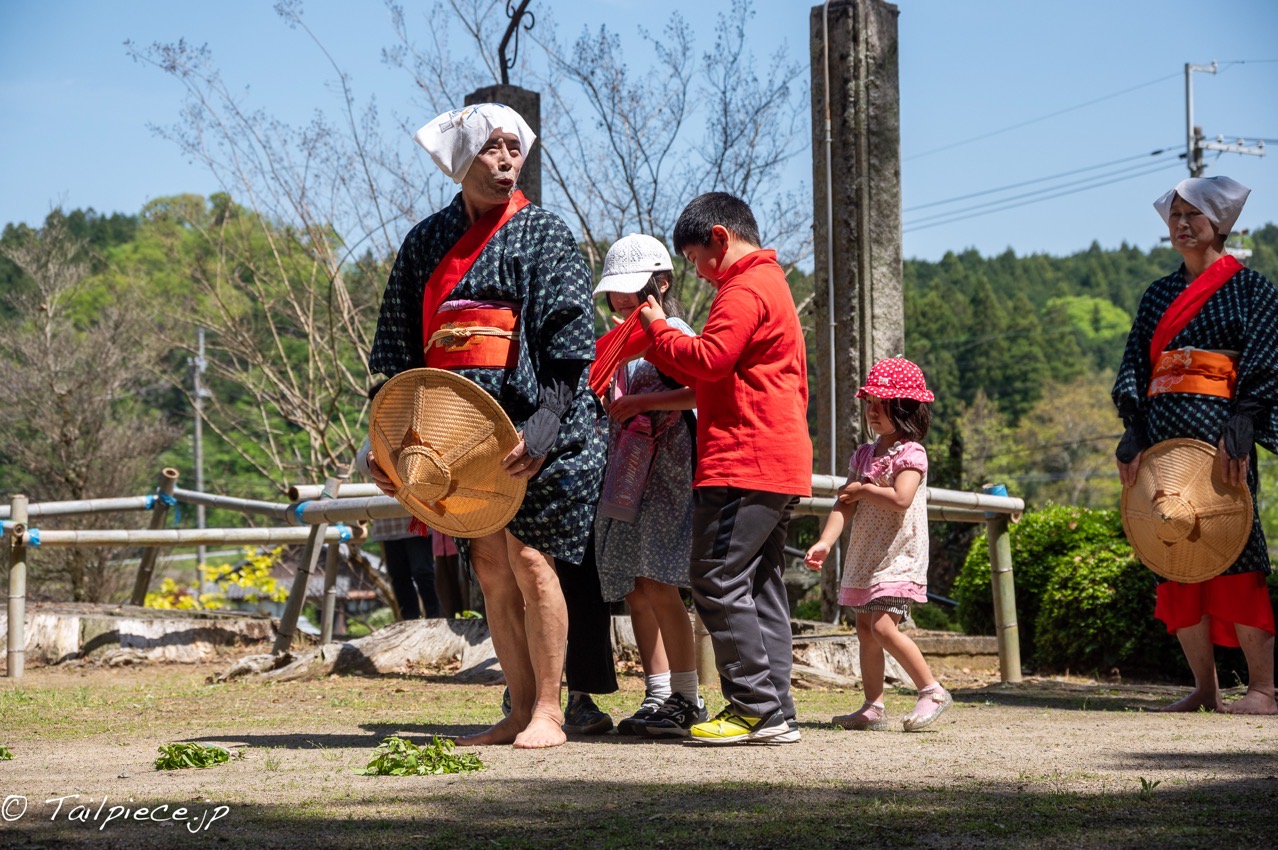 子どもたちは、田主役の大頭や早乙女の演技の最中に後ろから背中や尻を押したり裾をめくったりいたずらをします。演者も観客もみんなで楽しめるほのぼのとしたオンダ祭りでした。