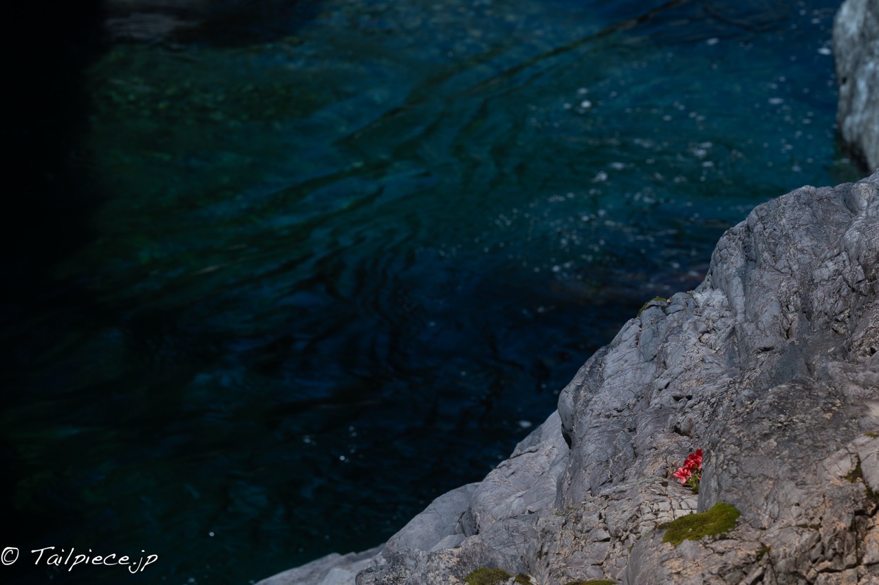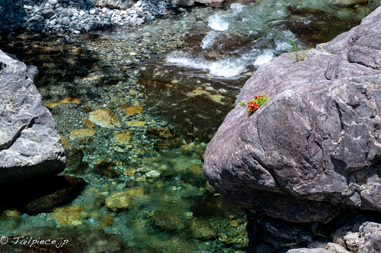 川に沿って走る県道から渓谷を覗き込んで、赤い花が見えると川に降りて撮影します。と言うものの、県道から川に降りられる場所は限られているので、アクセスできずに撮影を諦めることのほうが多いようです。