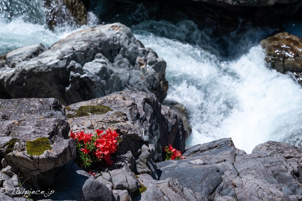 この時期の渓流の岩を注意深く見ていくと彩りよく咲いているイワツツジを見つけることができます。