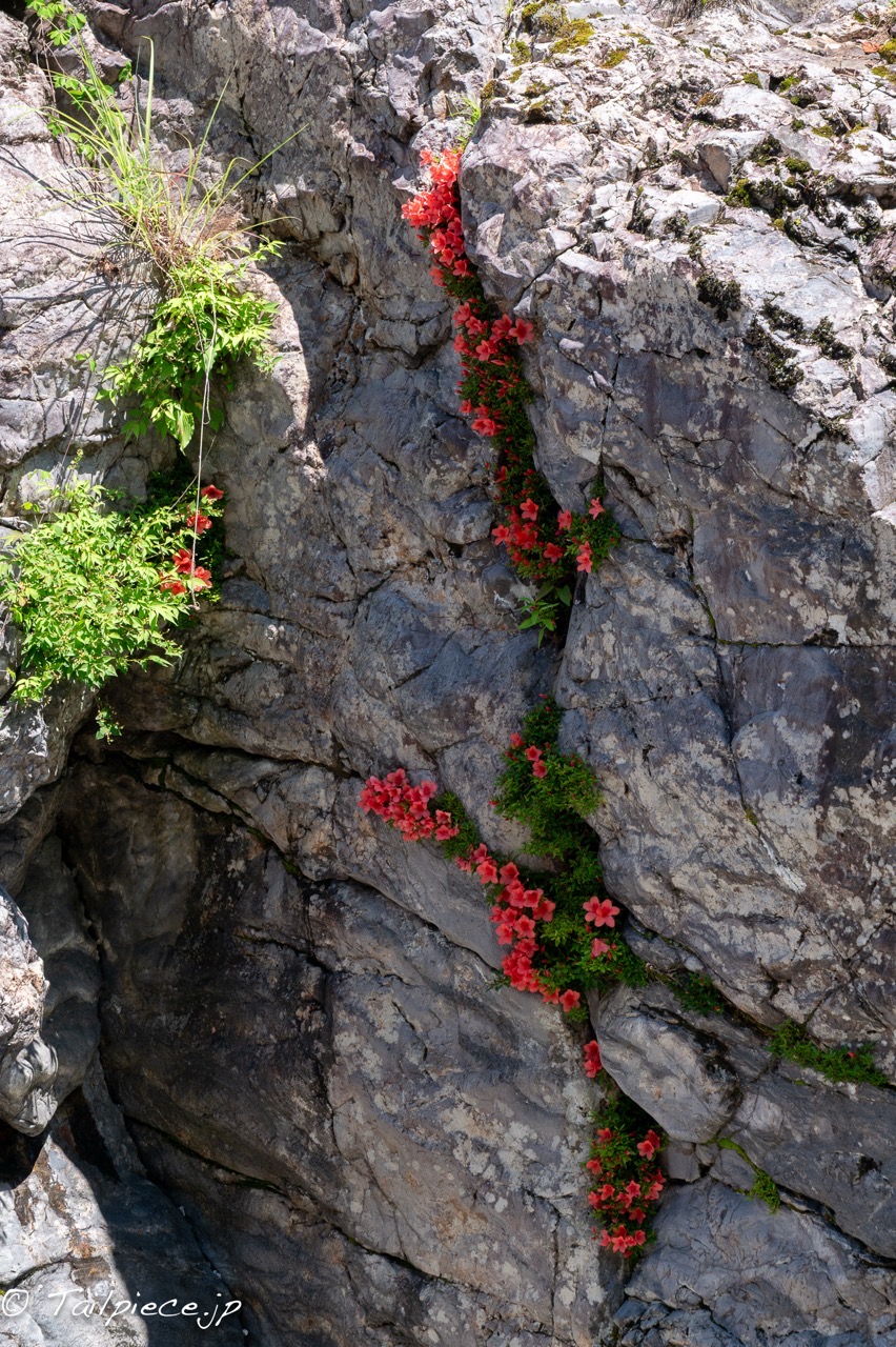 ほとんど土がない岩肌にしがみつくように生育しています。川が増水すると一気に流されそうな場所ですが、健気に初夏の渓谷を美しく彩っています。