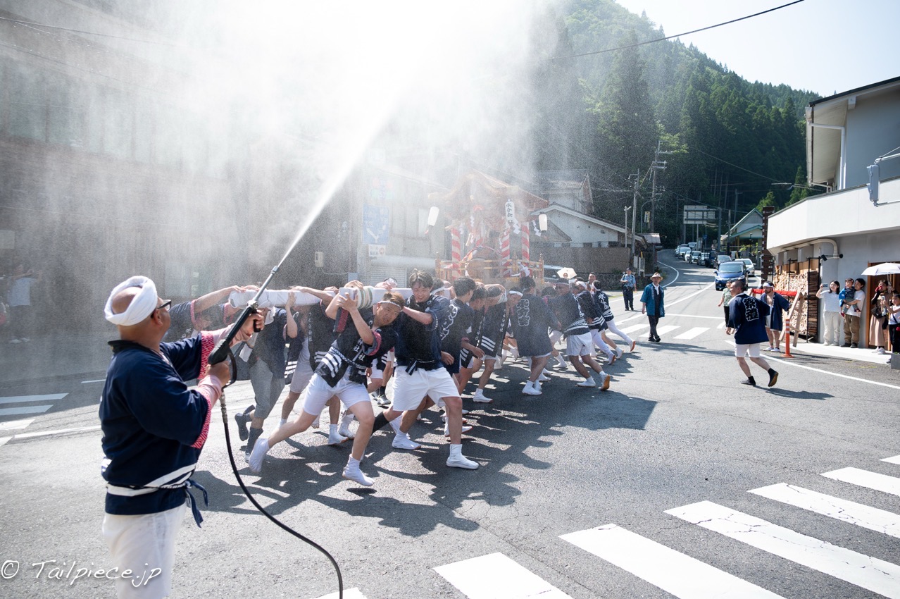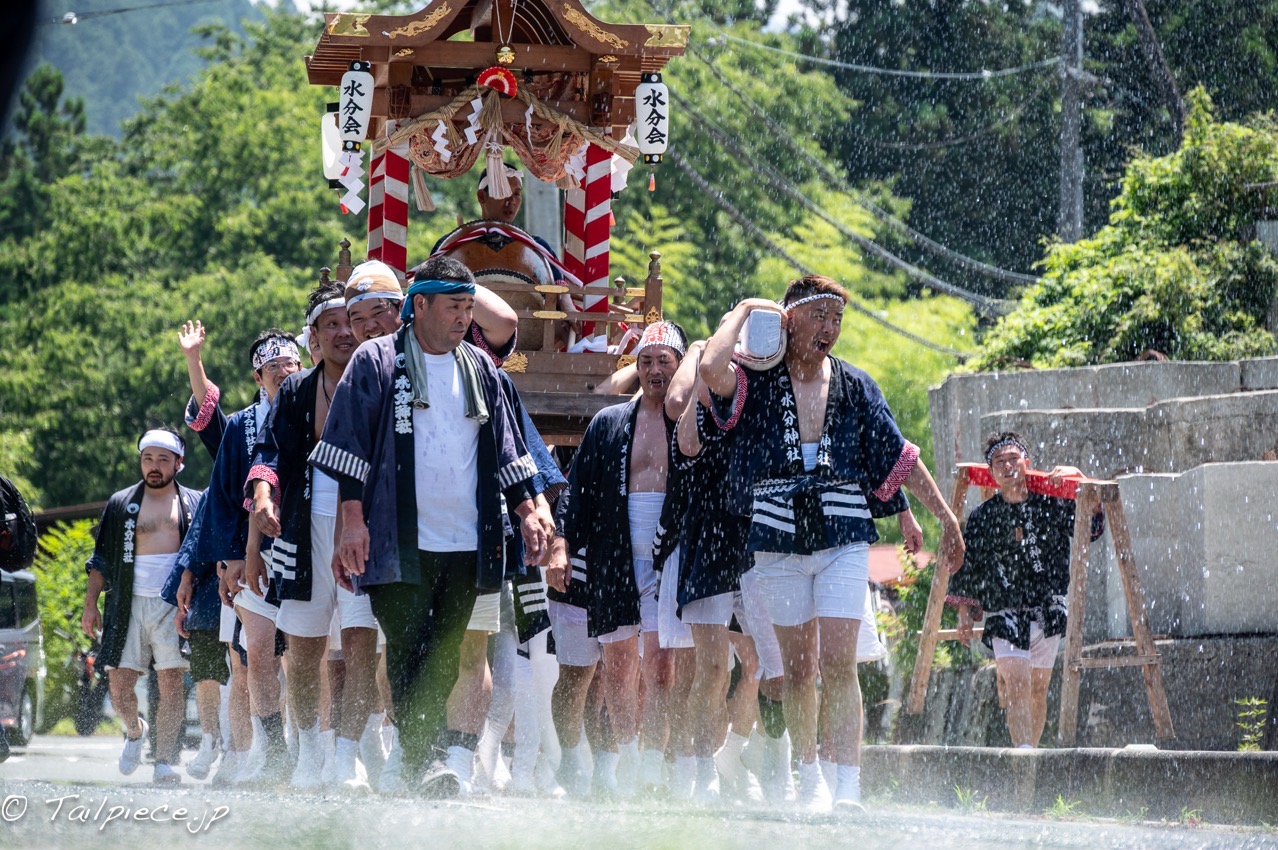 散水車が伴走していて神輿に向けて容赦なく水をかけています。業務用の散水車なので水圧はかなり高め、当たったら痛そうです。