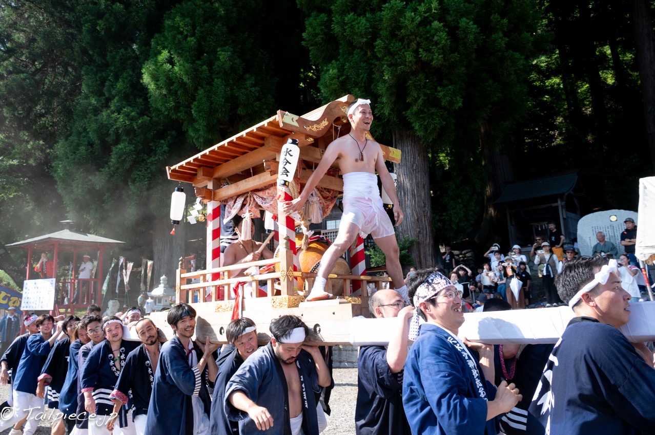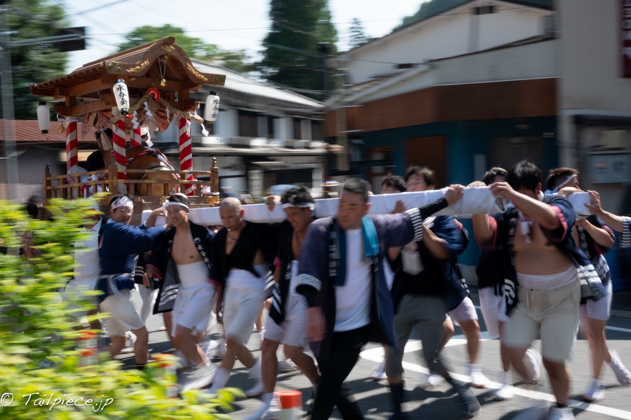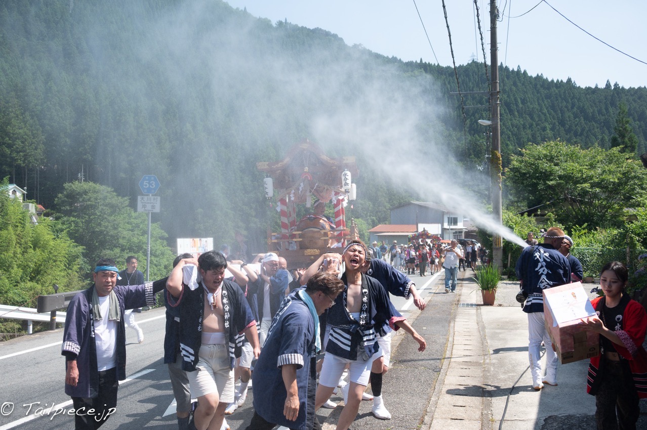 神輿にかける放水ミストにわざと入って、体を冷やしながらの撮影です。休憩場所で「カメラマンさんもどうぞ」と冷え冷えのPETボトルのお茶を頂いたのがとてもありがたかったです。