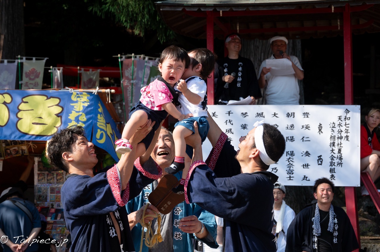 宮入りの熱気が収まった頃、境内では子どもさんの泣き相撲大会が始まりました。出場する力士(子どもさん)には立派な四股名がつけられていて、呼び出しによって四股名が呼ばれ土俵に登場します。土俵中央で子ども同士が向かい合い、先に元気に泣いた方が勝ちというルールです。土俵外の解説席では掛け合いで取り組みの解説が行われました。
