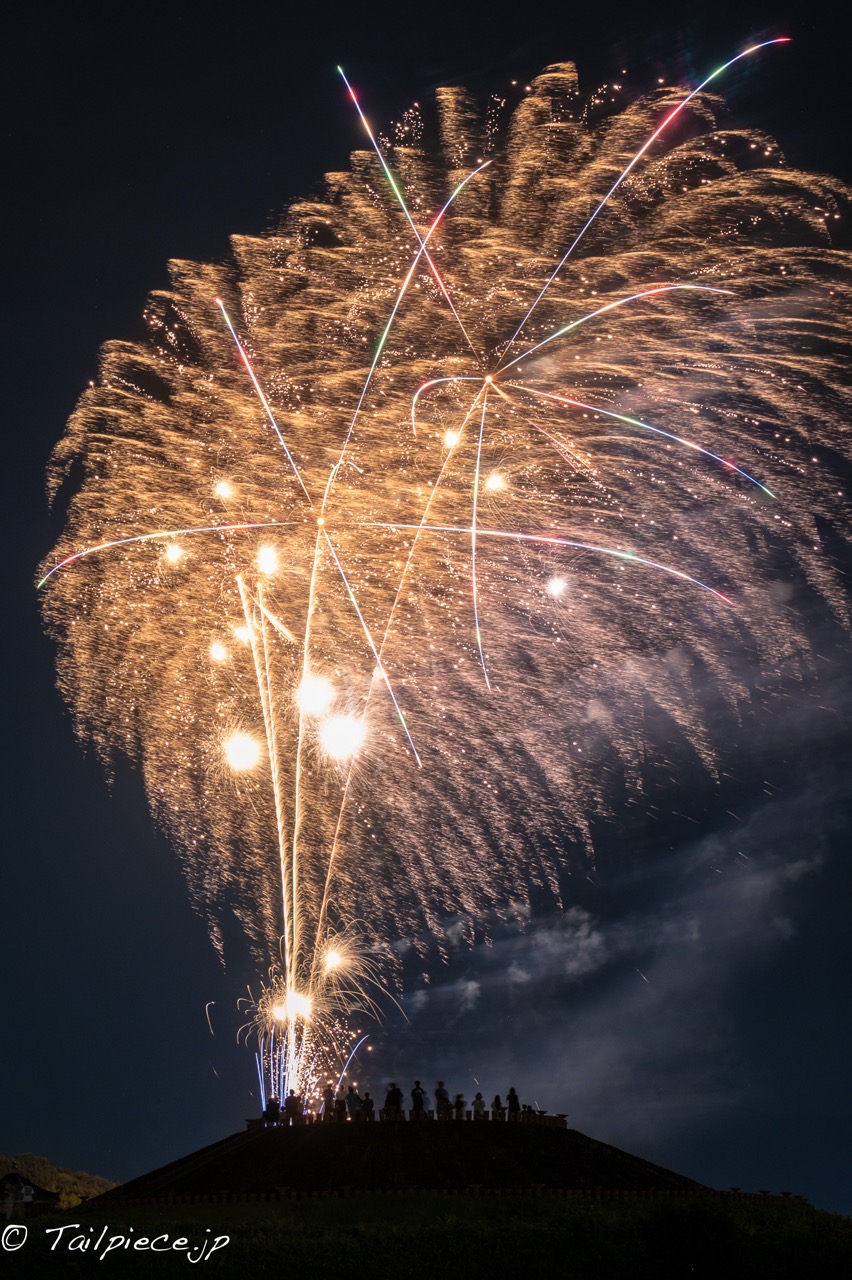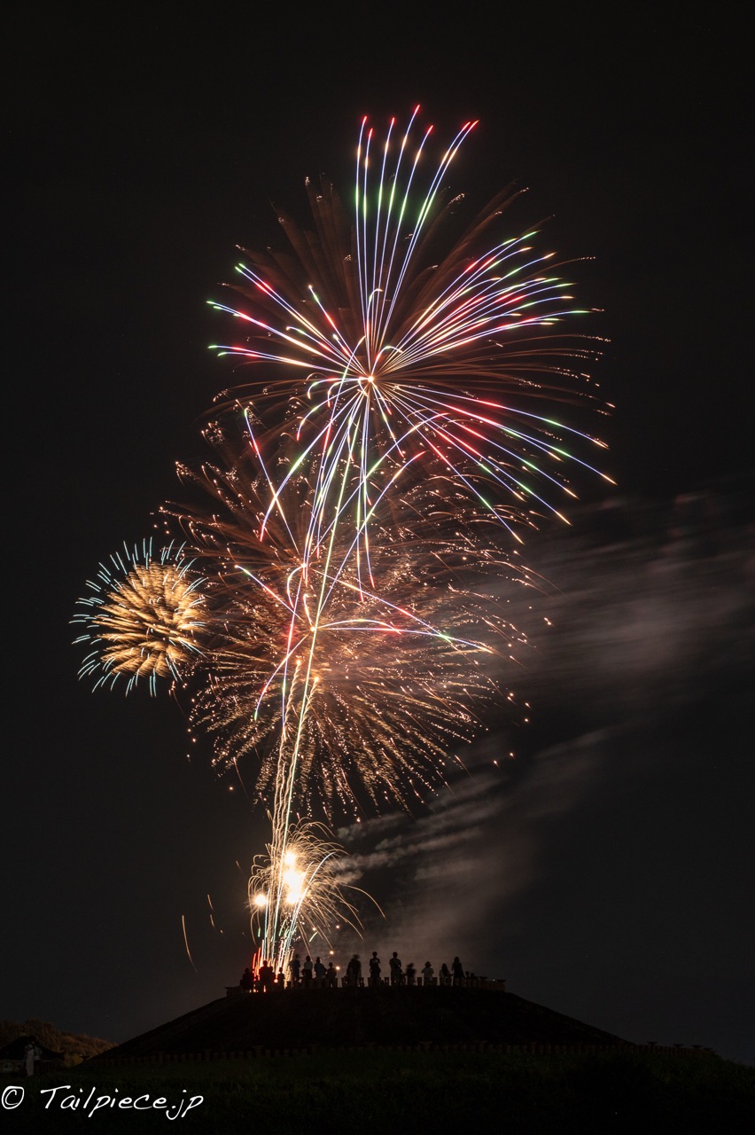 古墳と古墳の上の観客をシルエットにして花火を撮るのが良さそうです。始まるまでどこから花火が打ち上げられるのかわからなくて、花火が上がり始めてからみんなが三脚を抱えてあちこちポジションを探して右往左往しています。
