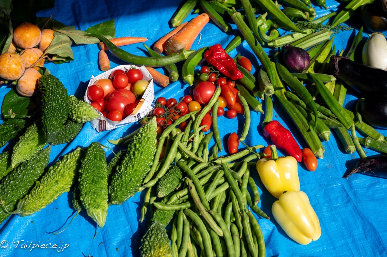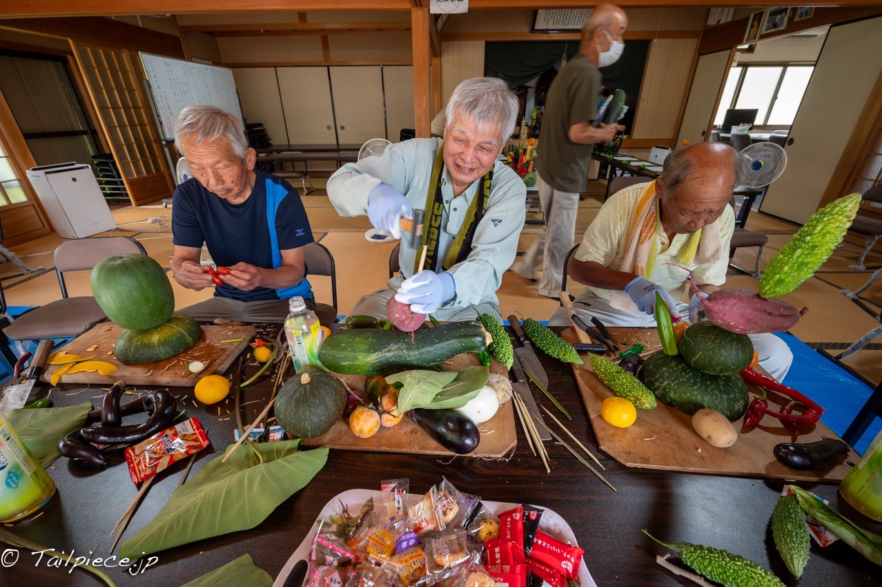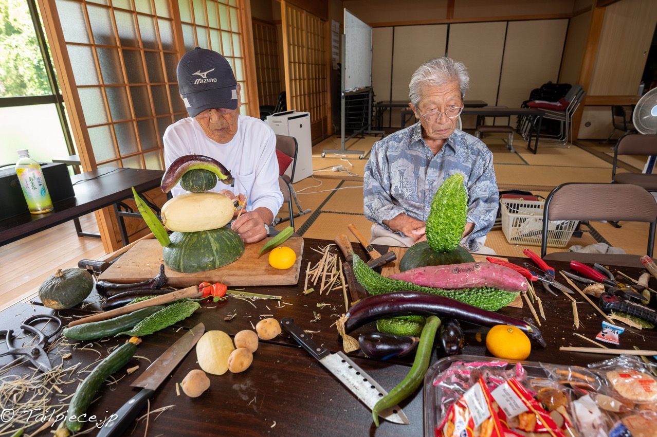 集会所の縁側には御膳の材料となる色とりどりの野菜が持ち寄られています。オクラ、ナス、トマト、インゲン、唐辛子、ピーマン、ニガウリと多彩な顔ぶれが揃いました。福住は高原地の気候を活かした野菜作りが盛んでどの野菜もとれとれつやつやの見事な野菜たちです。