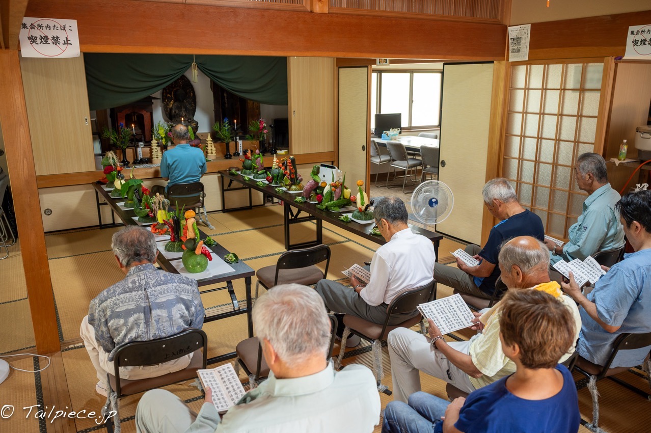 出来上がった御膳は本尊の薬師如来像の前に並べられ、すべてが揃うと念仏が唱えられお参りが始まりました。