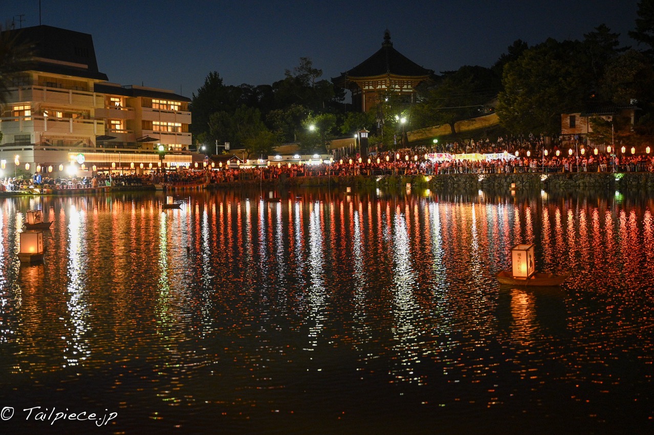 猿沢池では浮き灯籠に火が入り、光の装飾がゆらゆらと水面を彩っています。采女祭りは17時頃に駅前から猿沢池まで約200名が練り歩く「花扇奉納行列」から始まるのですが、猿沢池の周りはその頃はすでに人で一杯で、行列を見ていると管絃船の儀が見れるいい場所がなくなります。