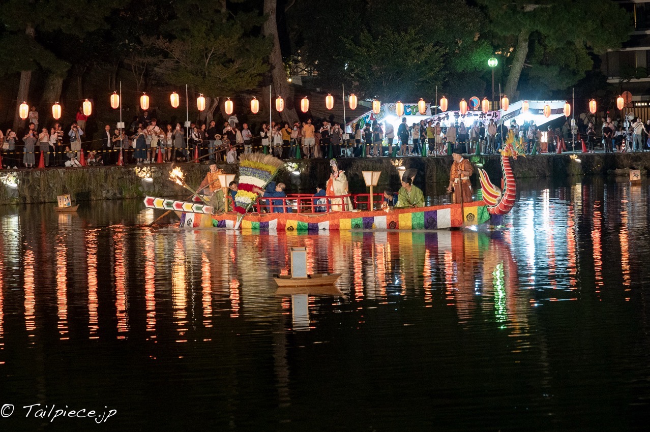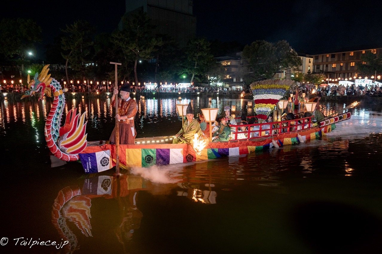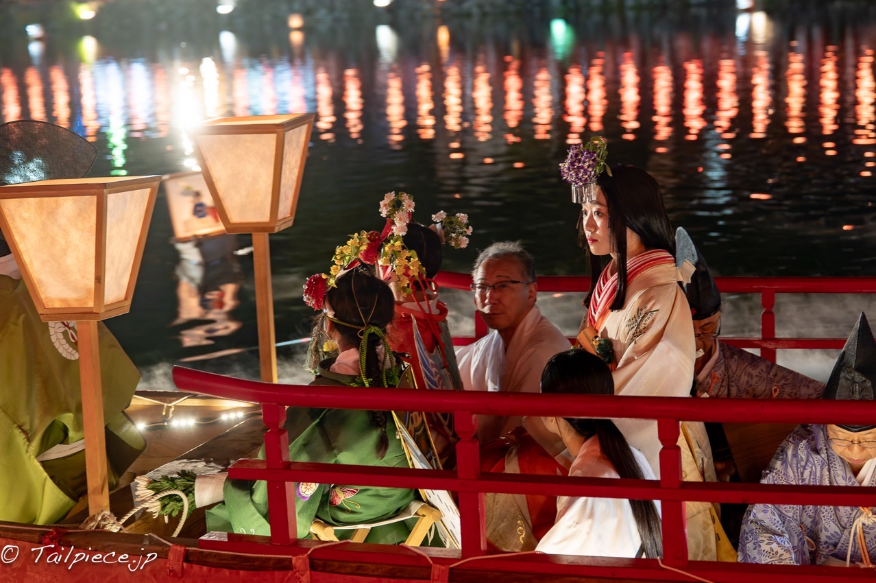 管絃船は池を2周し、最後に池の中央に移動して花扇を池に浮かべて采女の霊を鎮めました。
