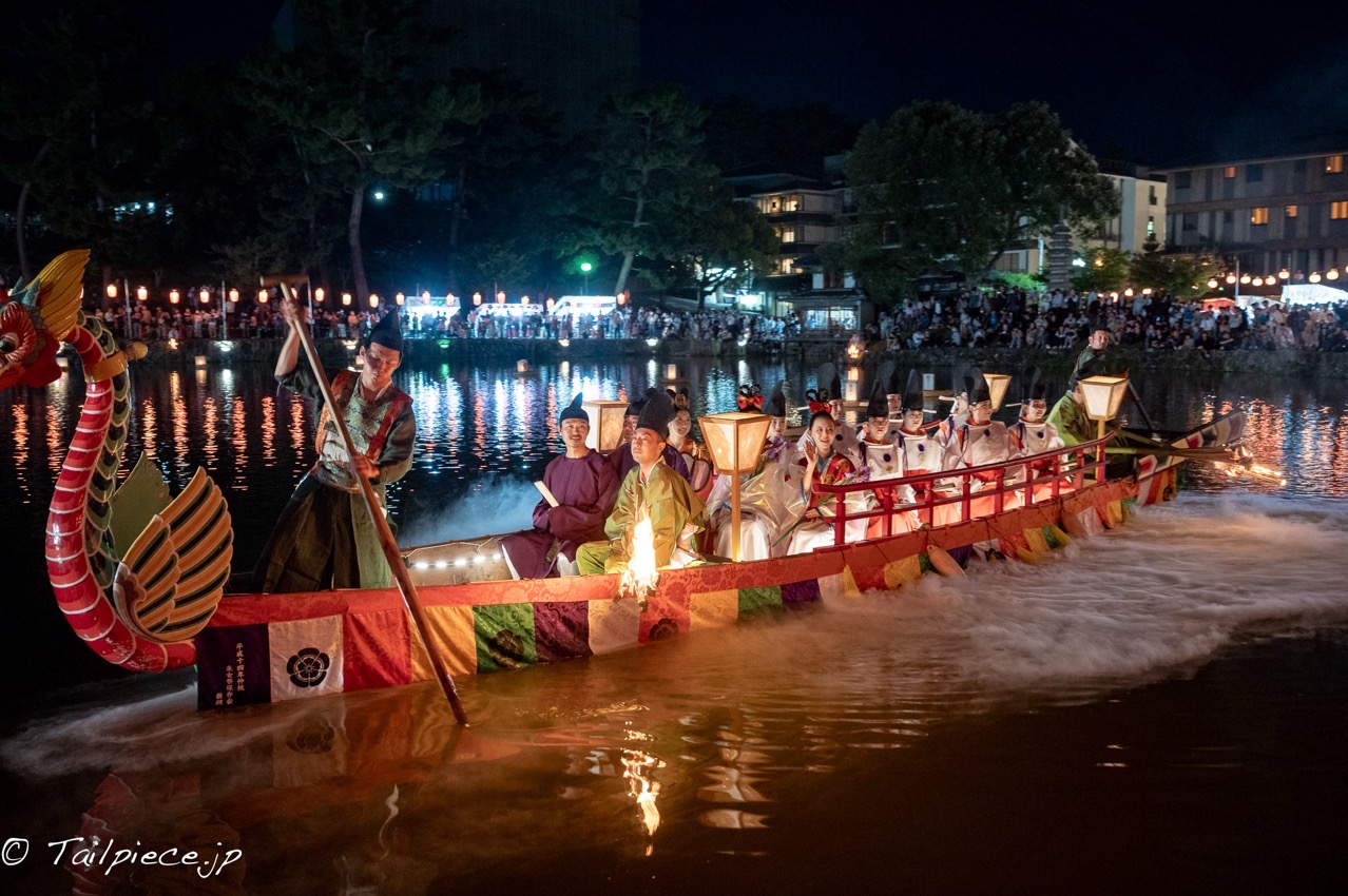 19時頃からは管絃船の儀が始まります。南都楽所による雅楽演奏のなか、2隻の管絃船が猿沢池を巡ります。