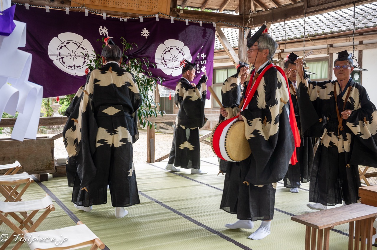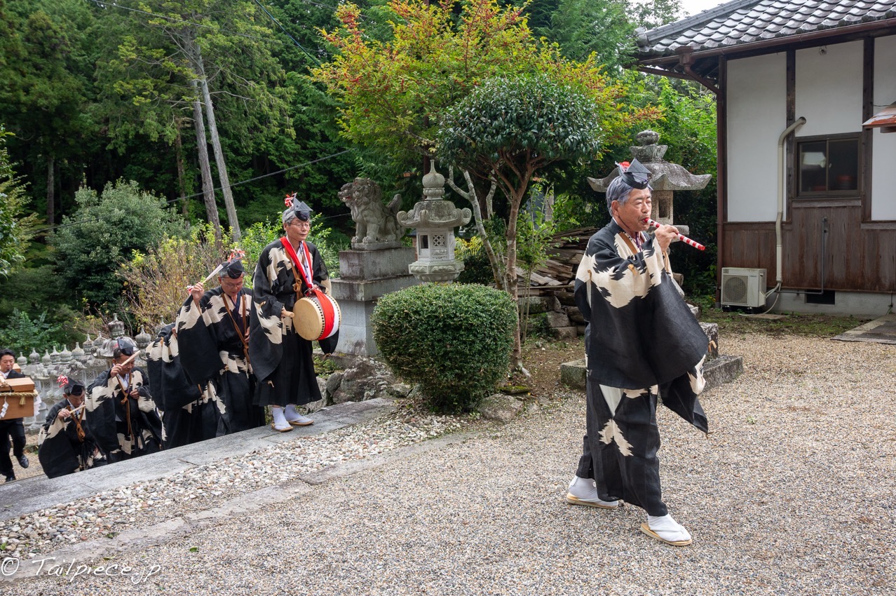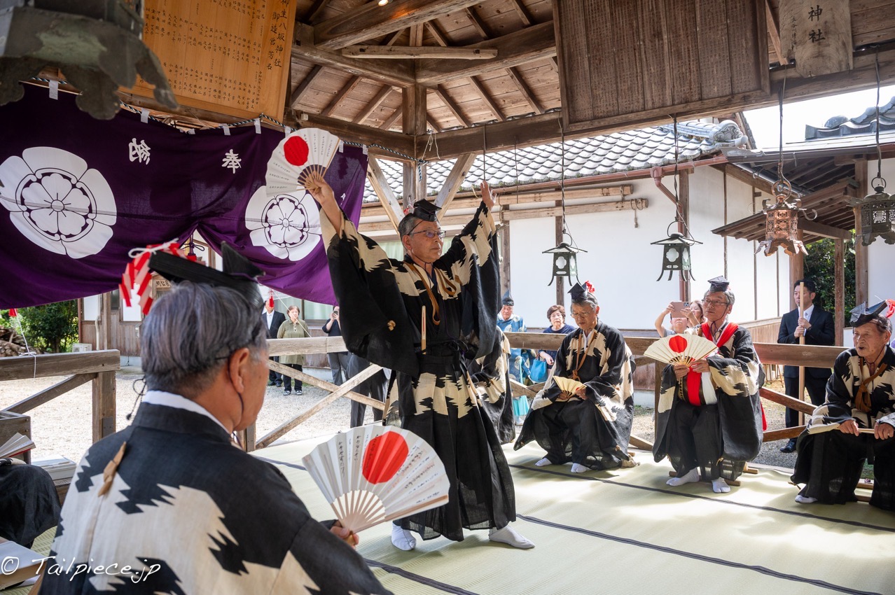 素襖(すおう)を着た宮座の人たちは、締太鼓や笛、扇子を手に神社に入ります。
