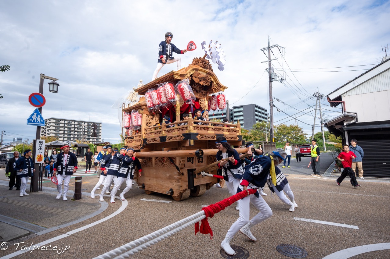 広い道路では辻を勢いよく地車を回し込み、直角に方向を変えます。