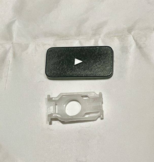 キートップをめくりあげると片側のヒンジ機構が外れていて浮き上がり、内部のパンタグラフの機構が見えています。これは明らかに壊れていますね。